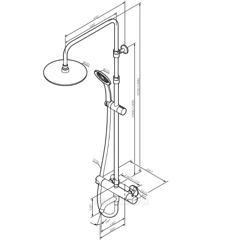 верхний душ, душевая лейка, душевая штанга, излив, смеситель, шланг для душа