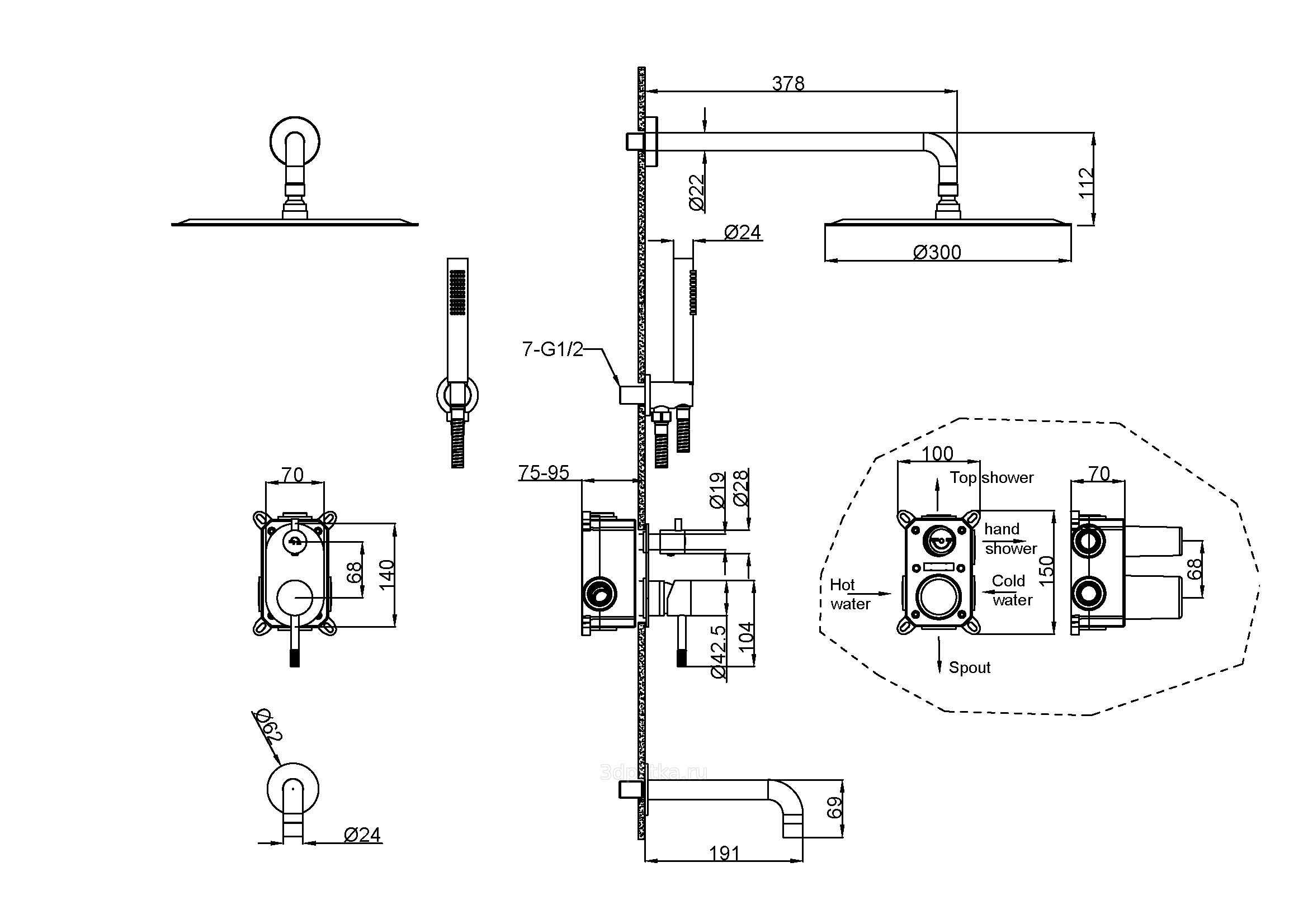 держатель для душа, душевой шланг, скрытая монтажная часть, смеситель, душевая лейка, кронштейн для верхнего душа