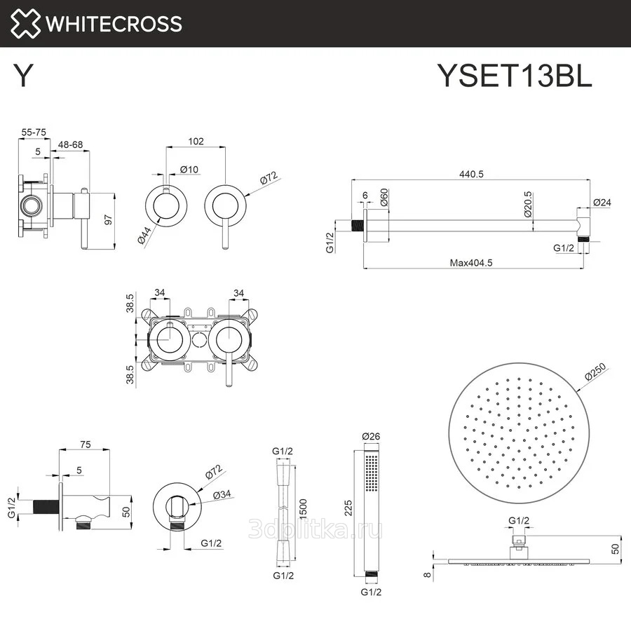 верхний душ, внутренняя часть смесителя, душевая лейка, излив, настенный держатель, смеситель, шланг для душа, шланговое подключение