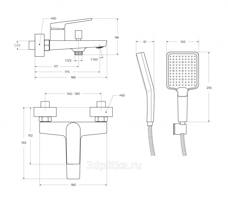 душевая лейка, душевая штанга, смеситель, шланг для душа