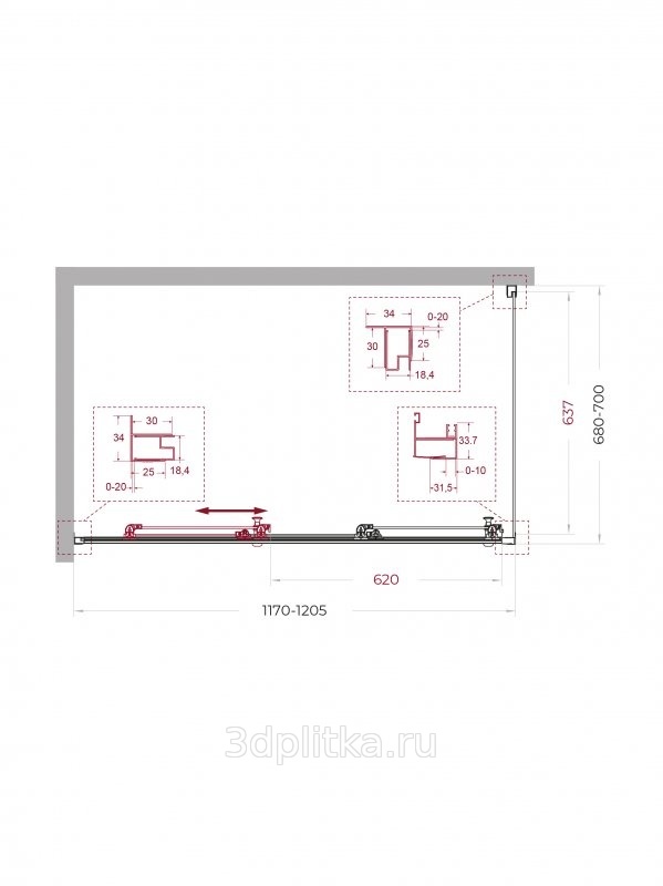 | Дополнительная информация: Регулировка ширины от 117 до 120,5 см, регулировка длины от 98 до 100 см. Модель: Uno UNO-195-AHF-31-120/100-C-Cr Ширина дверного проема: 62.0 см Цвет профиля: хром |
