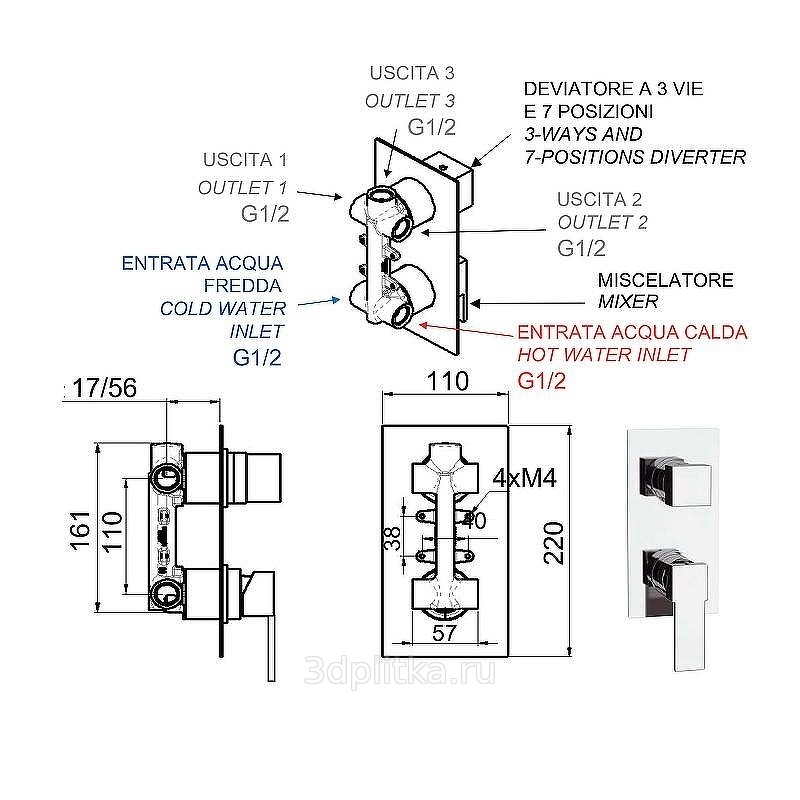 Remer Qubica Q937 Встраиваемый для ванны и душа Хром Смеситель для ванны с душем, Италия - фото 2