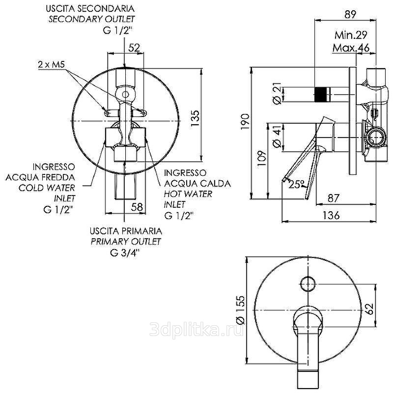 Remer Slash SL09H Встраиваемый для ванны и душа Хром Смеситель для ванны с душем, Италия - фото 2