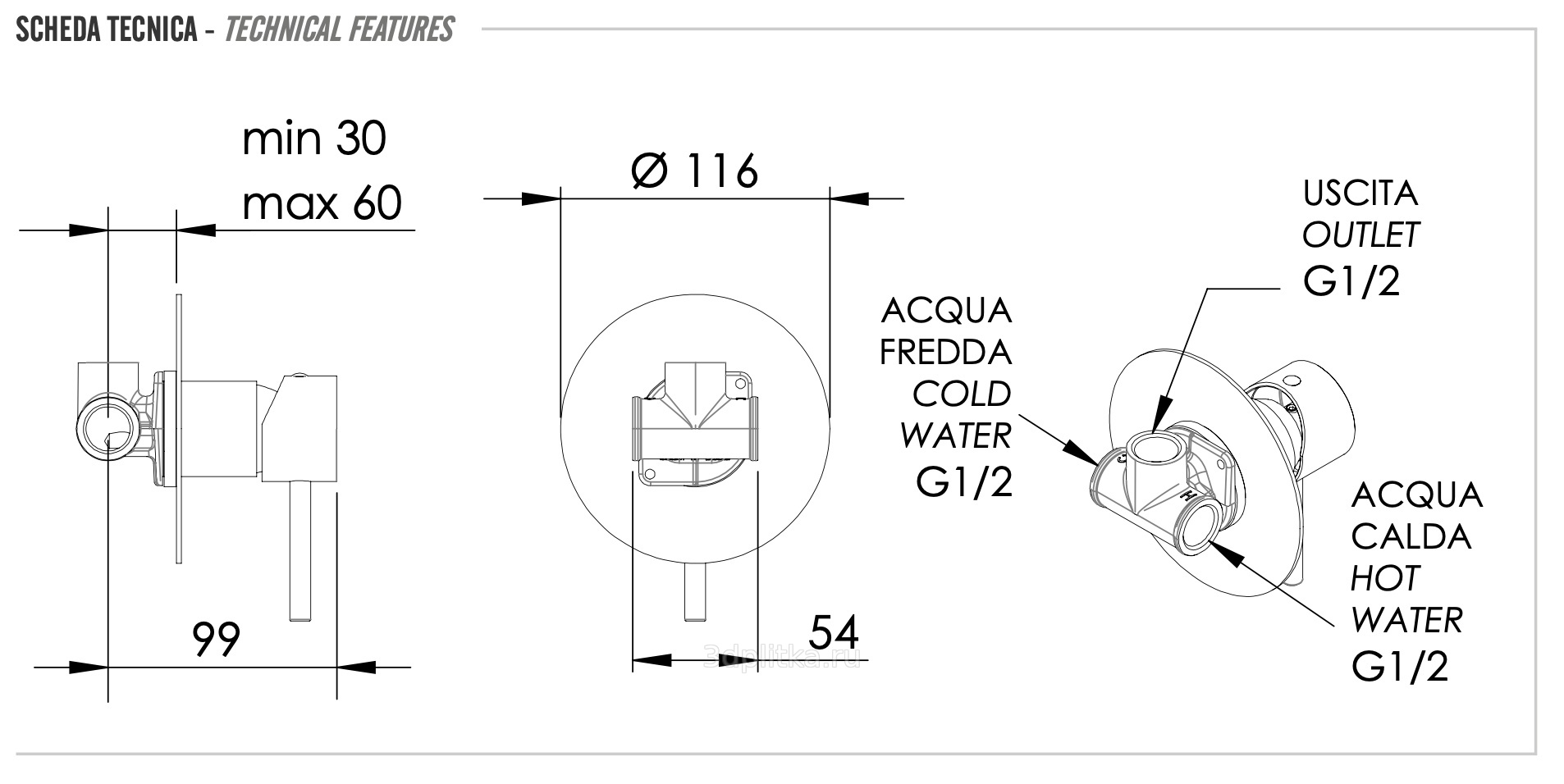 Remer X-Style X30LXV Встраиваемый для душа Сталь Смеситель для встраиваемых систем, Италия - фото 2